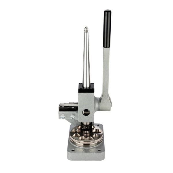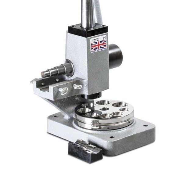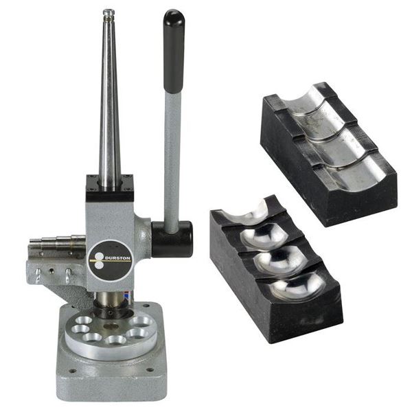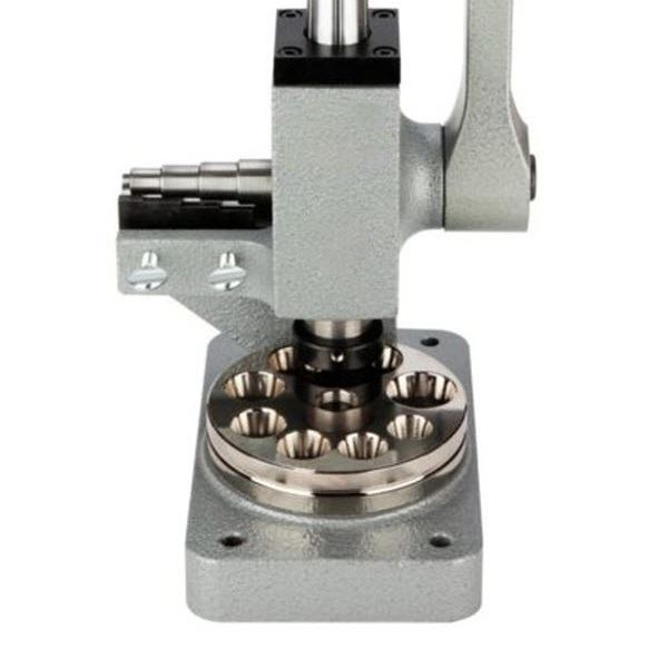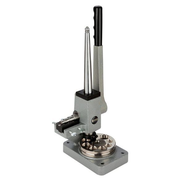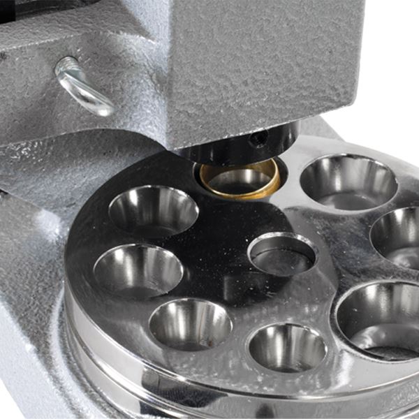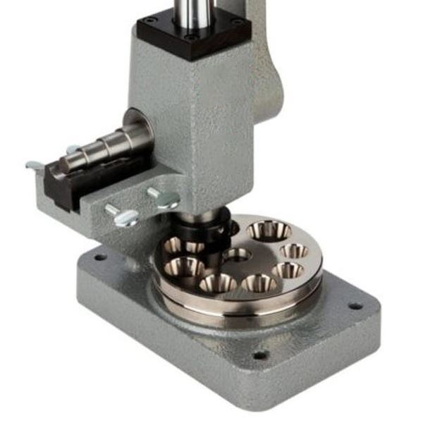 It is effective on even the heavy-weight hard alloy metals. Two matching dies are provided. The tool features six splines on its polished steel mandrel, ensuring exceptionally accurate ring sizing. This sizer will size non-ferrous precious and non-precious metal rings and bands. Its countersunk, polished steel, reducing plate will reduce bands up to 12 mm wide. The body is cast iron, powder-coated for long service life, and the base is drilled with four countersunk holes for mounting securely to your work surface (hardware is not included).