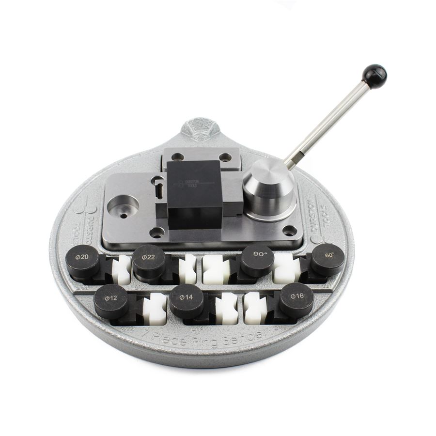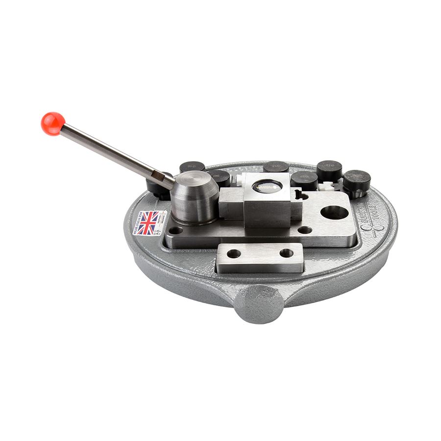 The dies line up perfectly together, and the complete unit sits into a 200mm diameter base with lifting handles. The base holder has screws to bolt down onto your bench, or you can use a strip to clamp it into a vice. The unique geared system gives great reduction, making bending effortless. We also offer optional Delrin dies (sold separately); five Delrin dies, precision machined to match steel round posts.