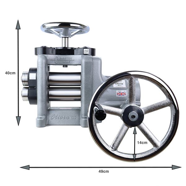 The mill is constructed from one piece of cast iron for maximum strength and rigidity. The roller length of 150mm, significantly wider than in most mills, gives extra space for a large flat rolling area, as well as 11 wire grooves. Each roller is specially induction hardened to 64 RC. The maximum thickness for flat rolling is 6mm, and the 11 square wire grooves range from 8mm to 1mm.