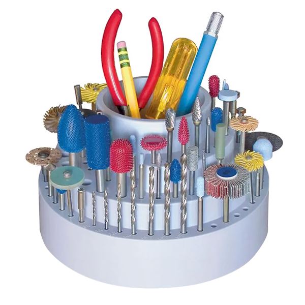 Rotating Bur and Tool Holder conveniently stores and organizes 112 accessories.