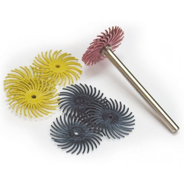 3M Scotch-Brite Radial Bristle Discs, 3/4 dia, 1/16 arbor hole. 38pc Assortment Pack with 6 of each grit- 80, 220, 400, Pumice, 6 micron and 1 micron. Includes mandrels A-M1 with 3/32 shank and A-M6 with 1/8 shank.