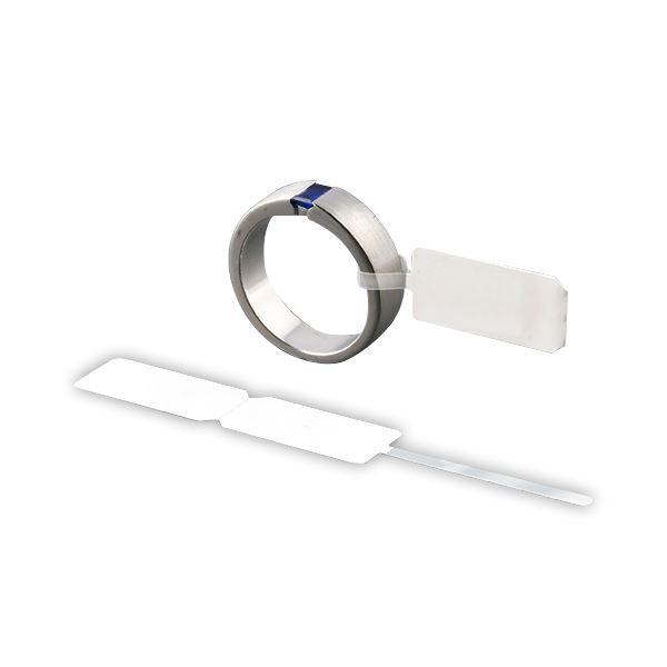 White glossy labels with narrow loop made of polyethylene. L...