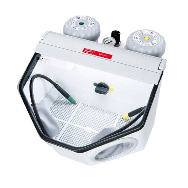 Space-saving fine sandblasting unit with 1-2 blasting tanks.
