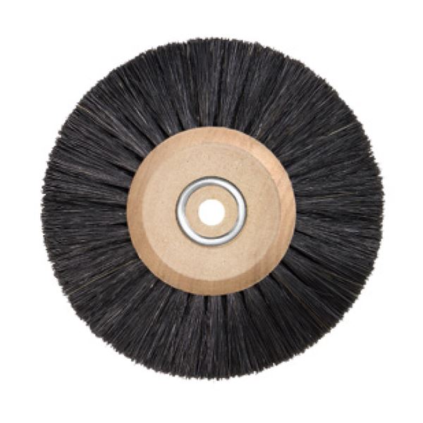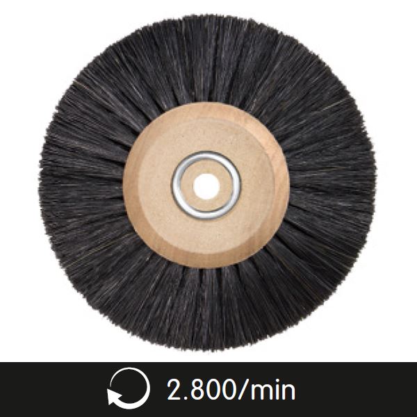 Short, hard bristles are suitable for processing/pre-polishingof hard metals and non-ferrous metals, longer, softer bristlesfor the pre-polishing of gold, silver and platinum, for example.For safe mounting on the spindle wooden core brushesare furnished with clamps. Muslin, fabrik insert and Scotch Briteensure an optimum base for the polishing paste.