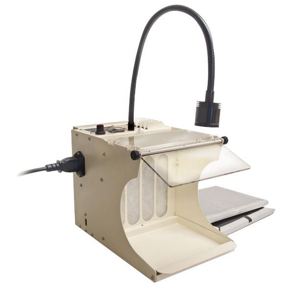 It offers strong suction power for removing particles of dust and reclaiming precious metal. The Filter Hood is made of powder coated, heavy gauge steel. It has a removable metal water-tight tray, gooseneck mounted bright, long lasting LED light, and a clear acrylic shield. Comes with three filters (1ea pleated, polyester and charcoal) that are easy to change and ship to a refiner.