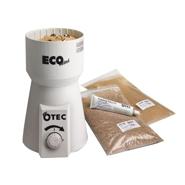 The ECO-mini is available in two designs, “wet” and “dry”. The dry polishing machine in the mini formatis predominantly used for polishing tarnished or worn jewellery or is used for the individual processingof heavy workpieces with delicate forms. The ECO-mini “wet” is predominantly used for very smallbatches or prototypes for the stripping of casting skins or emery traces. This makes the final polishinggreatly simplified and much quicker. Thanks to the usage of plastic abrasives no orange peel appearson the jewellery pieces.