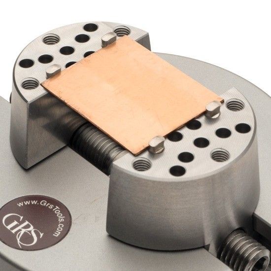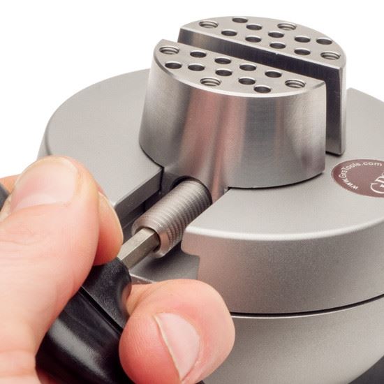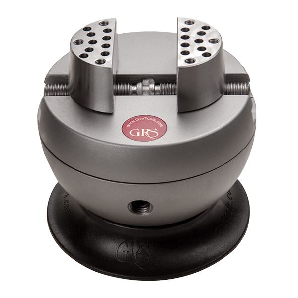 The new MicroBlock XL is a 3.1 kg vise with a 100 mm ball diameter. It is the perfect size between the GRS MicroBlock and GRS Standard Block. By utilizing the same jaws from the MicroBlock, the XL allows compatibility with all your favorite MicroBlock attachments. It also comes with two bases, one plastic and one rubber, for increased control. The small and maneuverable vise is great for stone setting, smallto- medium-size engravings, and other precision work. The internal rotational brake system lets the user choose the amount of rotational resistance from free to locked. Its low profile is suited for microscope work.