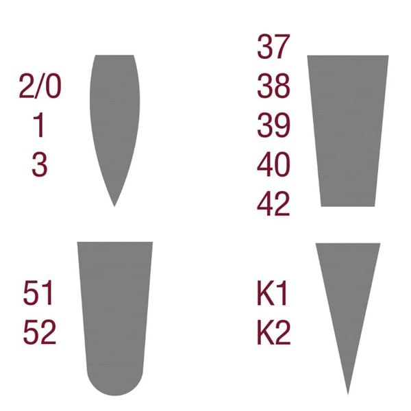 Onglette: 2/0, 1, 3 Flat: 37, 38, 39, 40, 42 Round: 51, 52 Knife: K1, K2