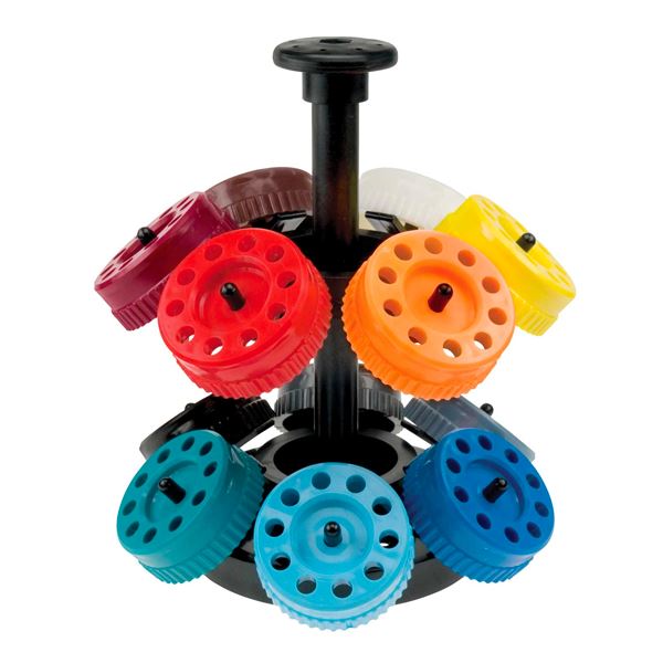 Collars slide over the tools above the QC Tool Holder. The colour coding system saves time and keeps tools organized. The trays are set at an angle for easy removal and quick view of graver points. The system of twelve trays holds a total of 120 QC tools (ten per tray) in a compact and structured way.