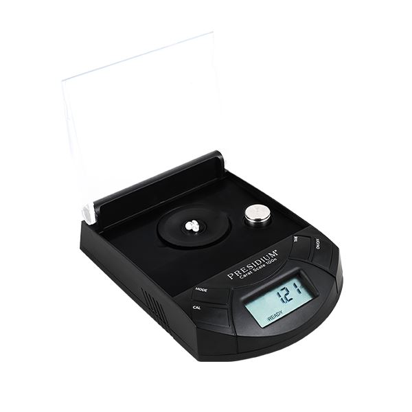 Digital pocket scale with detachable cover and LCD display.