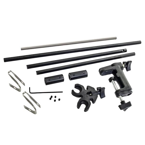 MAMH-1 features a 3-piece hexagonal support rod, top safety hook rod for holding one or two motors and the MABC-1 for attaching to any bench top up to 2-1/4 thick. The rod height can be adjusted with the locking screw built onto the clamp. Comes with a MAHR-2 Handpiece Rest that slides onto the hanger pole and secures your handpieces when not in use. Also has two UA10658 Spring Safety Clips that slide over the motor bale and on to the hanger rod to keep the motor(s) from jumping and twisting during start up and acceleration.