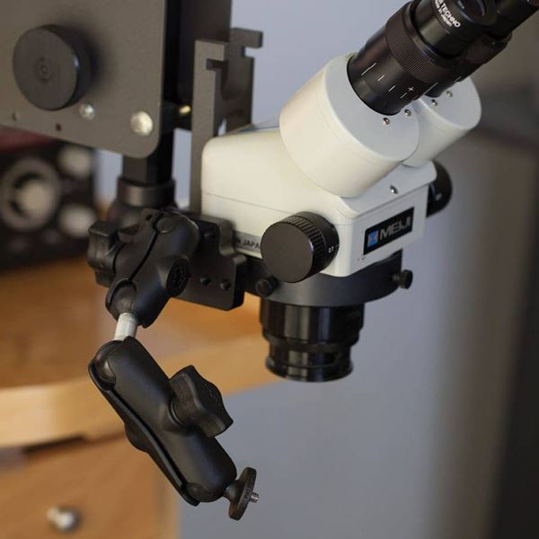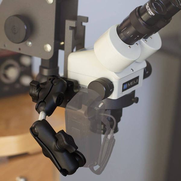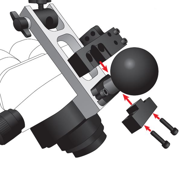 In contrast to older models, the ball pivot camera mount does not lengthen the distance to the point of focus. It is attached to the Acrobat Stand base and can be positioned to the left or the right. Its design means that it can be continuously moved into various positions. Appropriate for all cameras with a 1-inch screw thread (standard for most cameras).