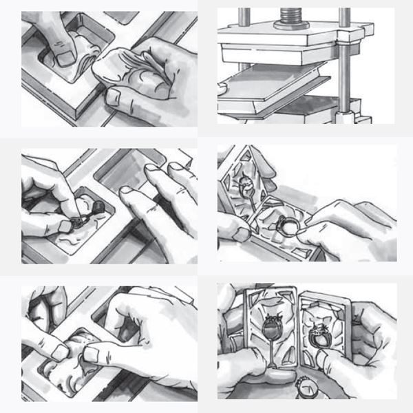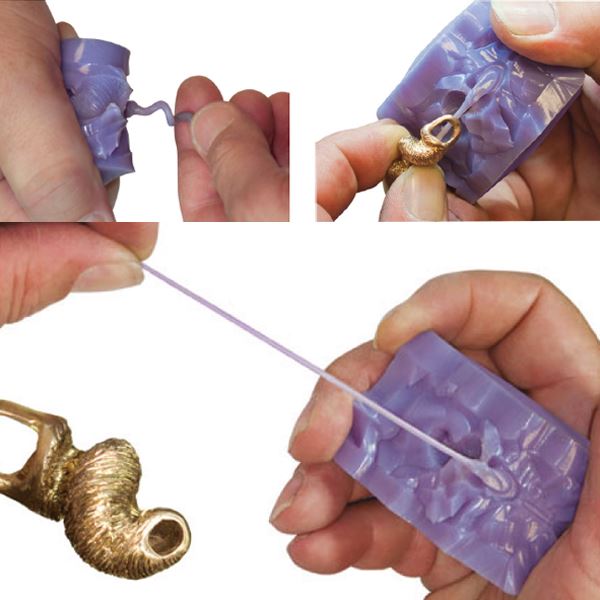 Castaldo silicone jewelry molding rubbers produce waxes with an extremely smooth high shine finish that won't stick to the mold. Smooth shiny waxes mean faster cleaning and less polishing of finished castings.Wax patterns release from the rubber easily without the use of messy powders or silicone sprays.Molds cut like butter yet resist tearing. Castaldo silicone jewelry molding rubbers make complex molds that are stronger than any other silicone molding rubber on the market. Molds last and last!Castaldo silicone molding rubbers will not discolor silver models.High thermal conductivity means that waxes cool more quickly, increasing the number of wax patterns that can be made per hour.Castaldo silicone jewelry molding rubbers make molds that are ideal for vacuum wax injectors because they seal between injections almost as if they have never been cut. A better vacuum is created for better flow and fill.