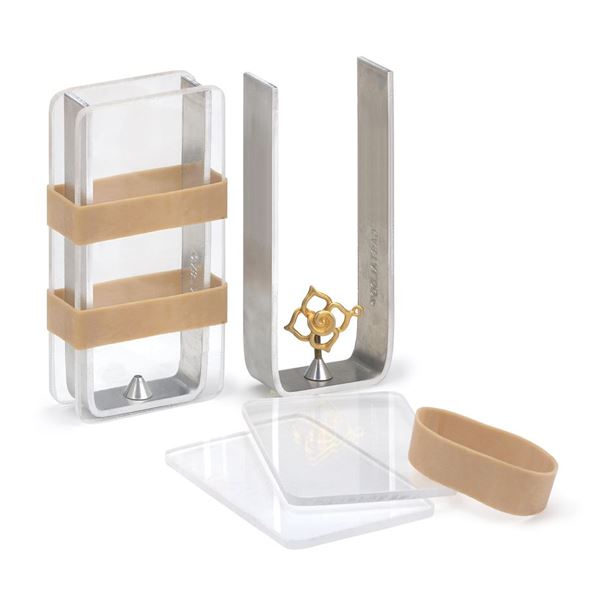 Liquid rubber mold frame for use with all RTV liquid rubber molds. Consists of a solid aluminum U-frame with built-in sprue former, two pieces of heavy-duty clear plastic and industrial bands.