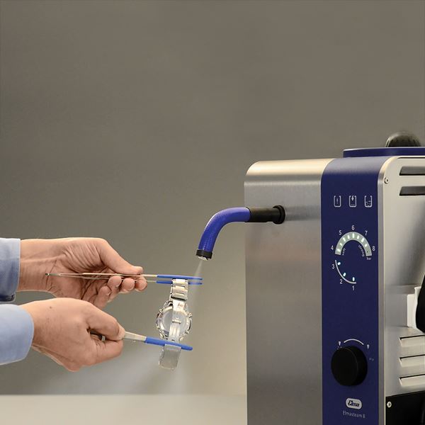 The individually adjustable Eco-mode ensures that the unit closes automatically down to 3 bar operating pressure in order to save energy and cost. Cleaned parts can be easily dried with the optionally integrated compressed air function. For more user safety, Elmasteam 8 basic has an integrated, automatic Lock-mode.